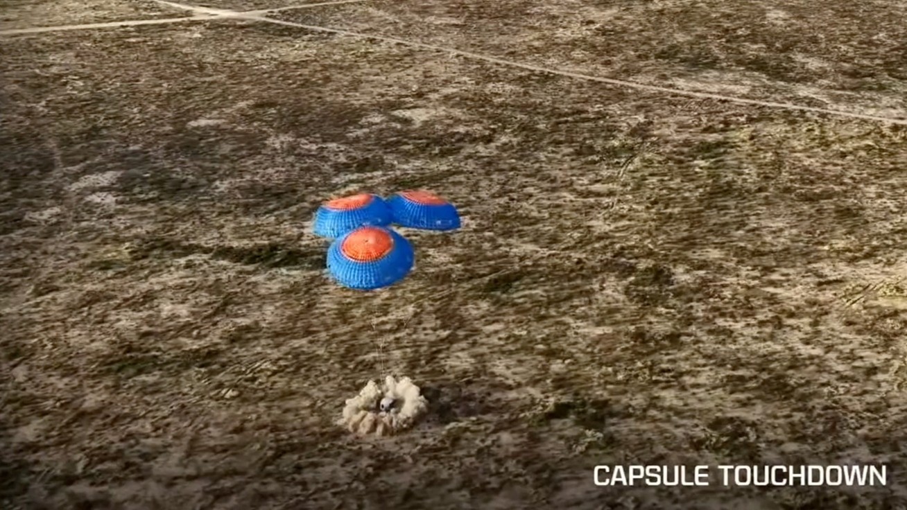 Khoang tàu vũ trụ New Shepard trong sứ mệnh NS-36 của Blue Origin hạ cánh xuống sa mạc Tây Texas, đưa sáu du khách vũ trụ trở lại Trái Đất vào ngày 8/10/2025. Ảnh: Blue Origin