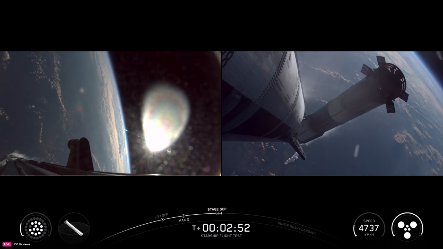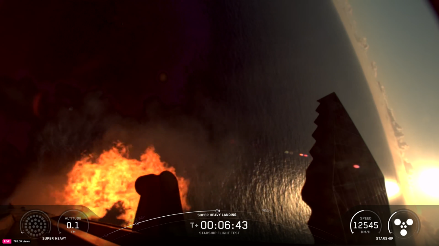 Super Heavy và Ship tách nhau sau 2,5 phút bay, và tầng đẩy hạ cánh chính xác xuống Vịnh Mexico 4 phút sau đó.