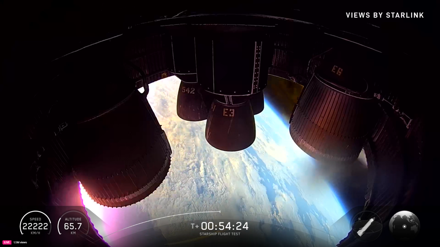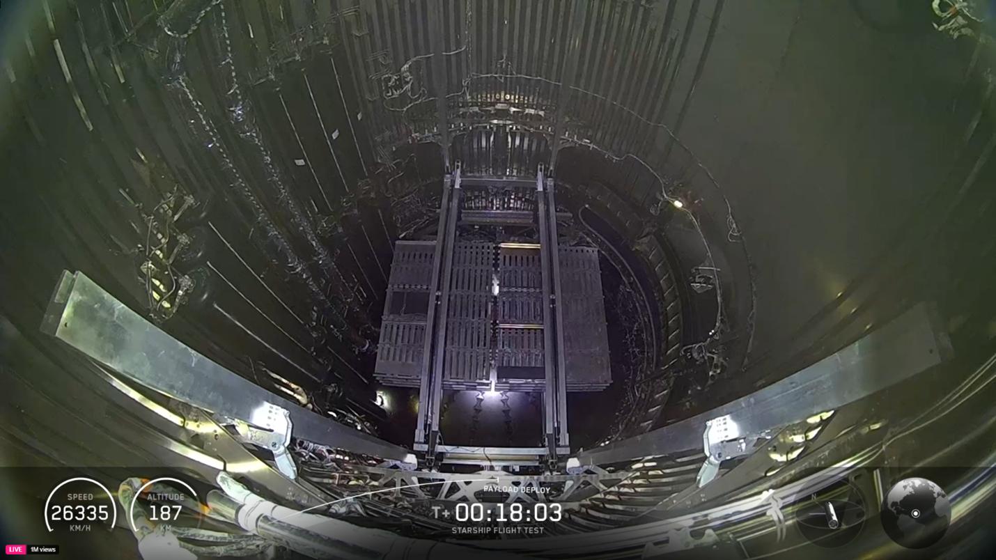 Ship thậm chí còn tái kích hoạt một động cơ Raptor trong không gian, chứng minh năng lực quan trọng cho các sứ mệnh tương lai tới Mặt trăng và Sao Hỏa. Phương tiện này cũng thả một số tải trọng thử nghiệm — tám mô hình giả của vệ tinh Starlink, được triển khai theo cùng đường bay cận quỹ đạo của Ship.