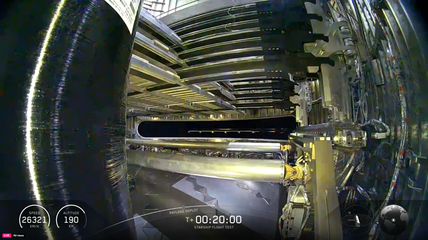 Ship triển khai tám tải trọng trong vòng sáu phút, bắt đầu khoảng 19 phút sau khi phóng, khi phương tiện ở độ cao 192 km. Nó cũng kích hoạt lại động cơ Raptor gần 38 phút sau khi cất cánh — hoàn hảo như kế hoạch.