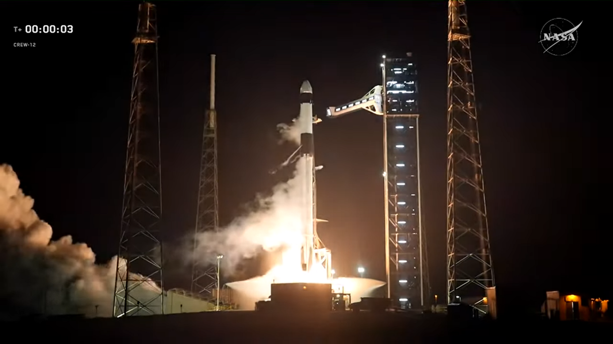 Tên lửa đẩy Falcon 9 mang theo phi hành đoàn Crew-12 thực hiện tắt động cơ chính khoảng 2,5 phút sau khi rời bệ và tách khỏi tầng trên theo đúng kế hoạch. Tầng đẩy B1101 sau đó đốt ngược và hạ cánh thành công tại LZ-40. Tầng trên tiếp tục đưa tàu Freedom vào quỹ đạo trước khi tách ra sau kích hoạt chèn quỹ đạo.