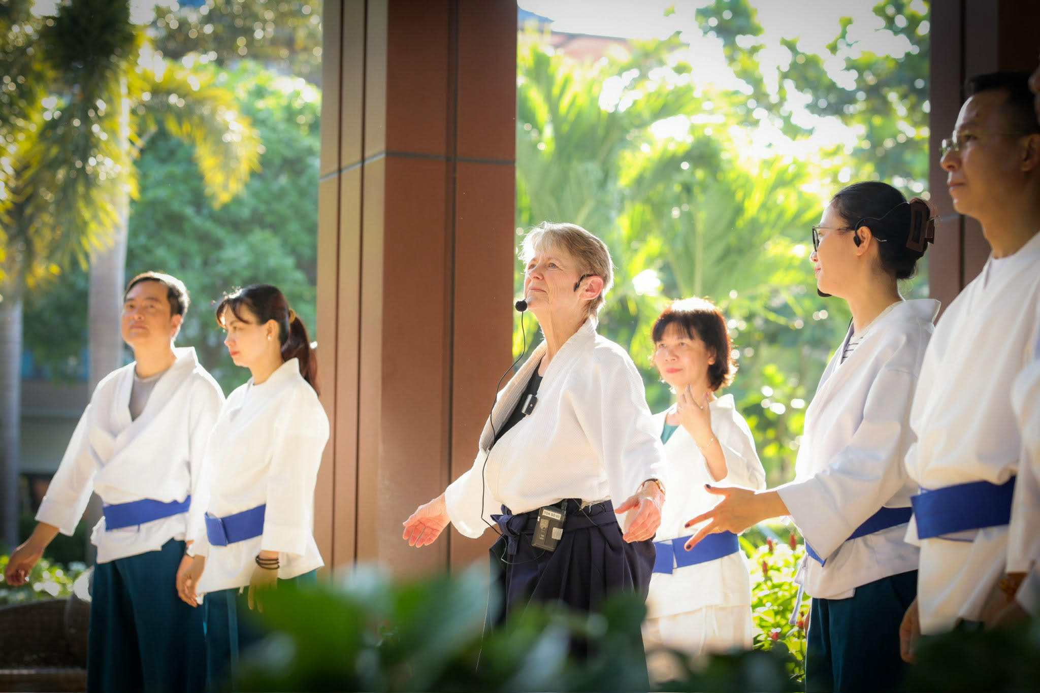 TS. Ginny Whitelaw trong võ phục Aikido – keikogi trắng và hakama đen – tại góc thiền do các thành viên Công